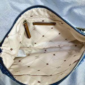 The LUCKY BRAND Denim Logo Chain Strap Shoulder Bag Purse is a stylish and trendy accessory for women. Made with denim exterior in a classic blue color, this small-sized shoulder bag features the brand's logo pattern and a secure zipper closure. The chain strap adds a touch of edginess to the overall design, making it a fashionable choice for everyday use or a night out. This purse is perfect for those looking for a chic and versatile handbag that can complement a variety of outfits.