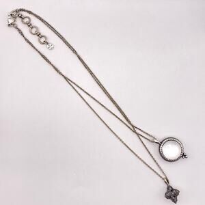 Signed LUCKY BRAND with their signature clover tag, this double layered necklace features a round and reversible puffy crystal with decorative silver tone bezel setting, and a 6 pointed ornate gothic silver tone bead with blue cz/crystals on the tips.
