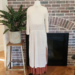 Cream colored duster with ¾ length sleeves, in a size small. Very airy fabric in a cotton, I wld say. (I cut off tag cuz it showed thru fabric) Duster hangs open but side ties can be tight/looser. (skirt in picture is also for sale )