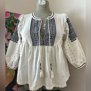 • "Made in a classic peasant top silhouette, this piece is embroidered with geometric patterns and oversized tassle ties for an elevated bohemian look you'll love wearing, no matter the season!"