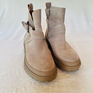 LUCKY BRAND Elyton Suede Zip Buckle Crossover Chunky Lug Sole Boots SIZE 8