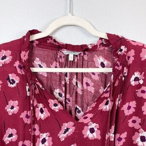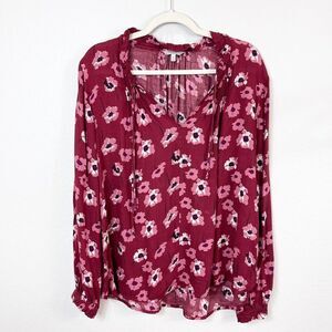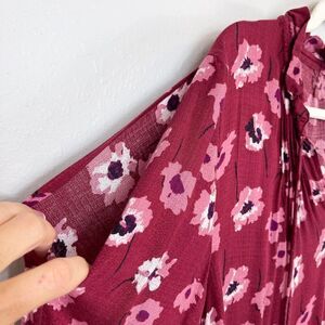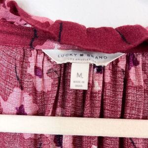 LUCKY BRAND Floral Cold Shoulder Blouse Size Medium. This is a wine colored blouse with a floral print. This has a keyhole neckline with an open tie detail. The sleeve hems are elastic. This also has a ruffled collar. This is in excellent pre owned condition with no flaws.