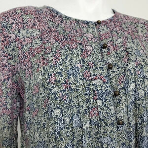 Lucky Brand Floral Print Top. Beautiful coloring of navy blue, purple, and green flowers. Pin tuck detailing on front with henley neck opening and brass buttons down chest. Buttons on sleeves as well. Flowy and comfortable, gives off a super cute boho vibe. Excellent pre-loved condition, no rips, tears, nor stains.