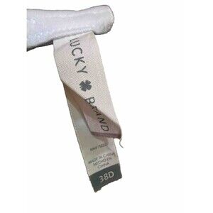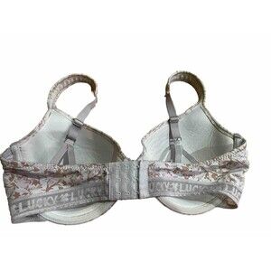 This Lucky Brand floral bra features bra strap closure with hook and eye fastening. The bra is made of 90% Nylon and 10% Spandex, making it comfortable to wear. The underwired bra with adjustable straps and back closure is perfect for everyday wear. It is an opaque t-shirt bra with lace and logo accents, and it is available in size 38D. Hand wash only is recommended for this regular-sized bra.