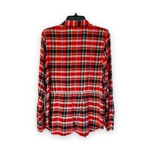 LUCKY BRAND, LONG SLEEVE, RED PLAID, BUTTON DOWN SHIRT. SKIRTED BACK WITH OVERLAPPED PLEAT. 100% RAYON. SIZE M.