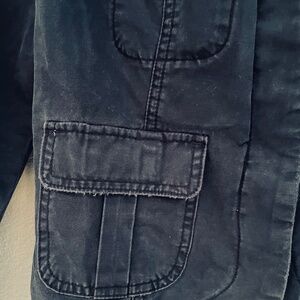 LUCKY BRAND lightweight/distressed brushed cotton cropped jean jacket with epaulets. Super cute, with a classic fit that looks great with almost any pants, skirts or dresses. 3/4 sleeves. Hidden button placket in front. Unlined. Color: Navy. Size: Medium, but fits like a Small.100% cotton. Condition: Excellent; gently worn; well maintained; no stains, marks, holes, or rips.