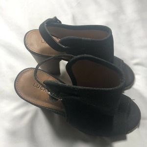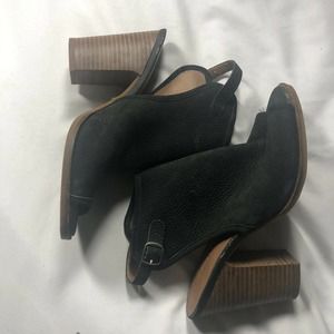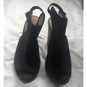 LUCKY BRAND Lisza Open Toe Bootie, Black Suede, Size 7.5. Condition is Pre-owned shows signs of wear and tear. Shipped with USPS Priority Mail.