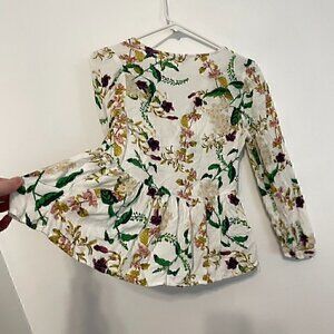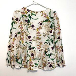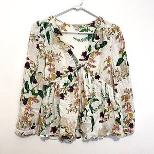 LUCKY BRAND Malia Peasant Top White Green Floral V-Neck Cutout Tie Long Sleeve