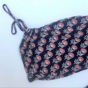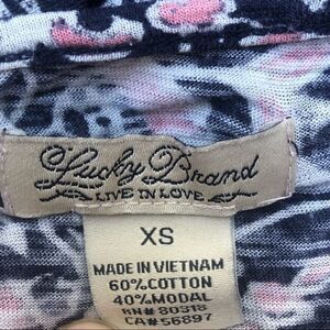 From Lucky Brand, a floral top with 3/4 sleeves with ties, pink floral motif over blue background, size XS.