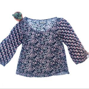 LUCKY BRAND PINK BLUE PAISLEY MIXED FLORAL PRINT 3/4 SLEEVES FLOWY TOP SIZE XS