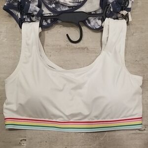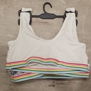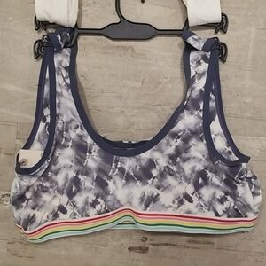 Bra #1: Blue & White Tie Dye Pattern + Rainbow Stripe + "Lucky" graphic