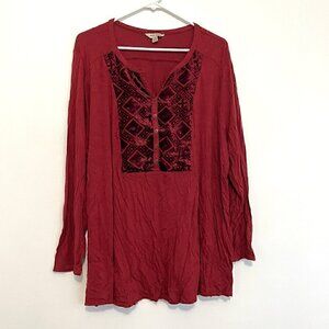LUCKY BRAND Plus Size Burnout Velvet Bib Henley Top Burgundy Maroon Red Roll Tab