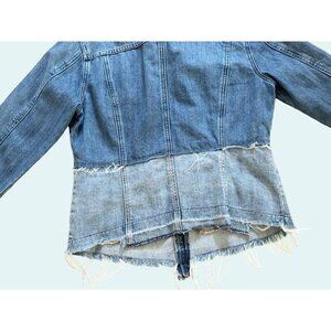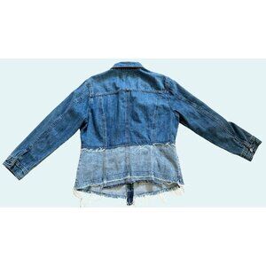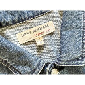 Cool jacket by Lucky Brand Re-Made. 2 different denim washes. Full button. 4 front pockets. Raw hem. 100% cotton. Size large. Pre-owned and gently worn in really nice condition!