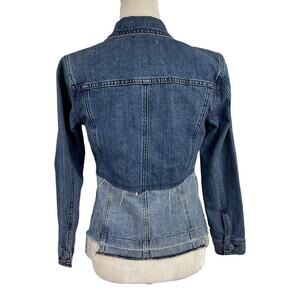 LUCKY BRAND Remade Distressed Denim Waisted Trucker Jacket Raw Frayed Hem Womens Size XS. Pieced button front jacket Grinding, dremmeling, destruction with fill yarn and fraying details. STYLE 7W14109