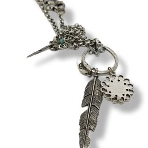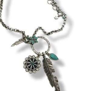 Fashionable southwestern or native American style necklace by Lucky Brand. Necklace is a silvertoned chain adorned with silvertone and turquoise color charms such as feathers, dreamcatcher and flowers. Necklace measures 21-1/2 inches in length with a 2 inch extender chain. Great condition