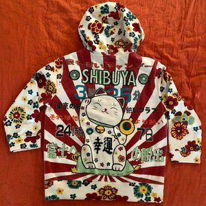 LUCKY BRAND SWEATSHIRT HOODIE* LUCKY CAT*SHIBUYA*JAPAN*EMBROIDER*ASIAN CHARACTER