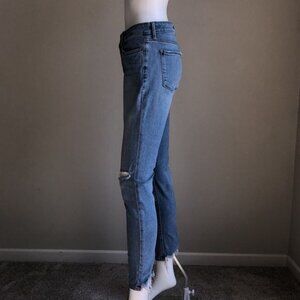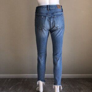 Light wash, skinny fit with intentional distressing.
