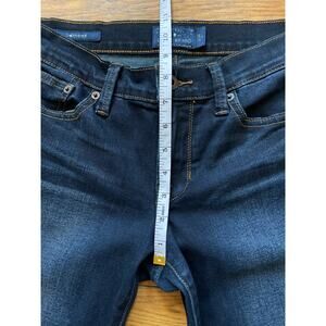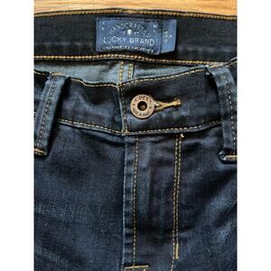 Lucky Brand 'Sweet Boot' Raw Hem Jeans in size 2/26 (actual 28). These boot-cut, dark wash jeans feature a 5-pocket design, logo stamped rivets and button, raw hem and a zip closure. The spandex material adds a comfortable stretch, making them perfect for all day wear. See below for actual measurements.