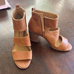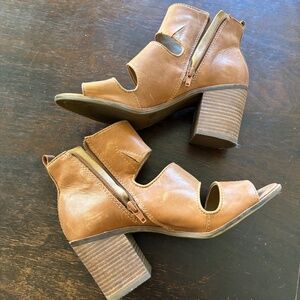 Lucky Brand tan leather shooties. Natural marks in leather (see pics.). Exhibiting BoHo chic vibes - flows smoothly in your Summer to Winter wardrobe. 3 1/4" stacked heel. Sz 7 1/2 (37 1/2).
