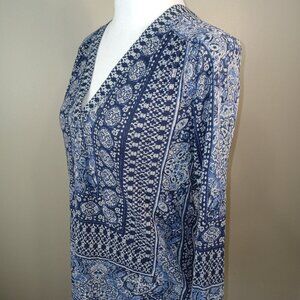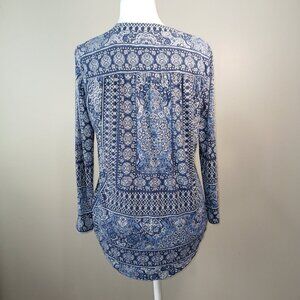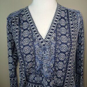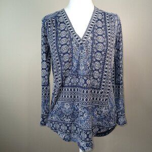 LUCKY BRAND TOP, GEOMETRIC PRINT, BLUE AND WHITE COLOR, VNECK, SIZE SMALL