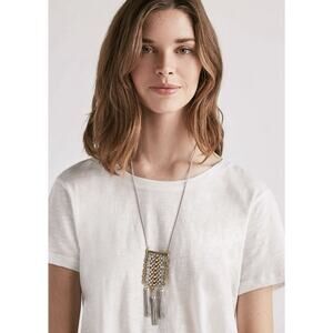 This necklace by Lucky Brand is a stylish and versatile accessory for women. The 2 tone beaded design with a tassel accent adds a unique touch to the piece. The adjustable length of 25" ensures a comfortable and customizable fit for any occasion such as engagements, holidays, anniversaries, or birthdays. The silver and gold mixed metals used in the construction make it a versatile and eye-catching addition to any outfit. The lobster closure provides a secure and easy way to wear the necklace.