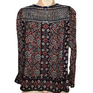 Elevate your wardrobe with this stunning Lucky Brand women's top! The burgundy & navy geometric pattern and bohemian accents like crochet detailing make it perfect for any occasion, whether it's a casual day out or a travel adventure. The V-neckline and pullover closure add a touch of elegance, while the lightweight fabric and long sleeves with button cuffs make it versatile enough for any season.