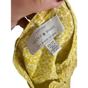 This LUCKY BRAND blouse is a vibrant yellow with a floral pattern. It has short sleeves and comes in size XS, making it perfect for the summer season.