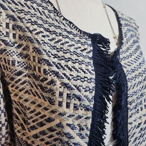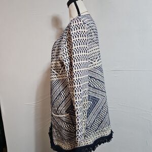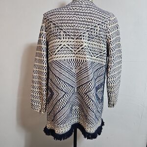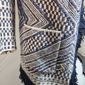 LUCKY BRAND cream&blue tweed fringe trim open front boho cardigan womens size M