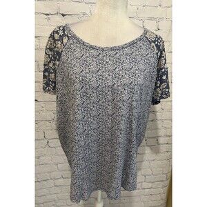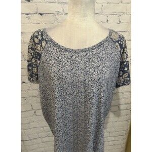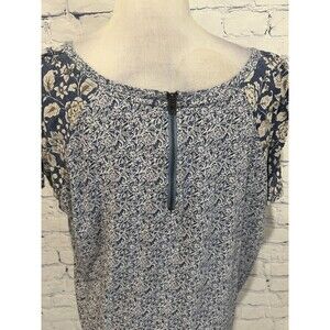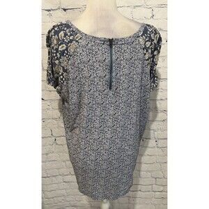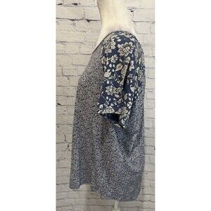 This Lucky Brand shirt for women features a floral print with a 1/4 zip back for a stylish and versatile addition to your wardrobe. Made from a comfortable blend of cotton and modal, this short sleeve top is perfect for casual occasions in the blue color. The hi-low hem and XXL size make it a flattering and practical choice for plus-sized women, while the woven fabric and easy care instructions ensure convenience and durability. Ideal for summer, fall, and spring seasons, this breathable and stretchy t-shirt with a modern flower theme is a must-have for any fashion-forward woman. 24 inches pit to pit and 27 to 30 inches long. Smoke free home.