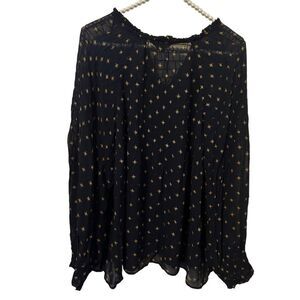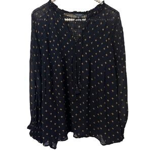 LUCKY BRAND womens 2X Top Navy Blue Gold Star Print Smocked Semi Sheer boho peasant