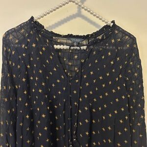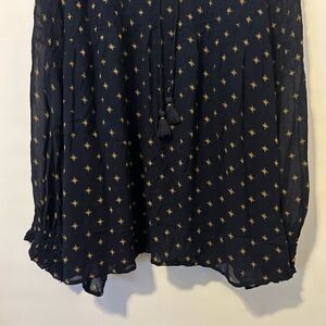 LUCKY BRAND womens 2X Top Navy Blue Gold Star Print Smocked Semi Sheer boho peas