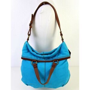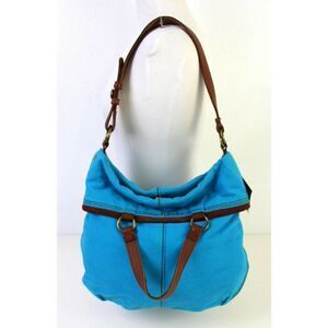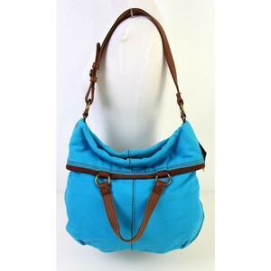 LUCKY BRAND BANDIT FOLDOVER BLUE COTTON BROWN LEATHER TOTE SHOULDER BAG HANDBAG