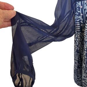 Lucky Brand flowy pullover shirt with sheer navy blue sleeves and bodice. The shirt is a very pretty geometric pattern. The bodice has tiny horizontal pleats and the sleeves rows of open ribbon sewn the length of the sleeves. Very good condition. Woman's size L