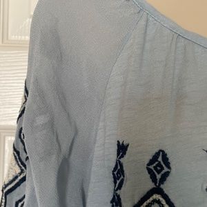 Three quarter sleeved top from LUCKY, soft delicate material on sleeves but front and back of top are nice light COTTON!! Navy blue and white embroidery detail. Shirt only worn once. Great condition, I just can't wear it any more myself as it no longer fits me.