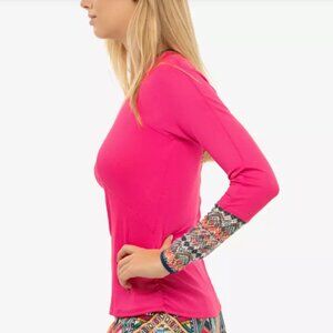 Shocking pink long sleeve in a lightweight rib fabric. Featuring multicolored block ink print design done on a fish net mesh along the neckline and cuffs, feminine design lines, contrast neckline and ruching details along the midriff for a flattering look.
