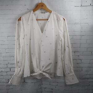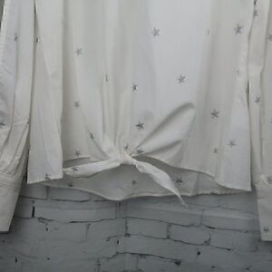 LUCKY BRAND WHITE LONG OPEN SLEEVE SILVER STAR V NECK FRONT TIE TOP SIZE SMALL