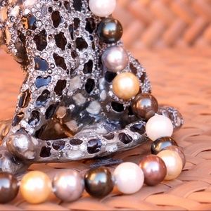 18" Genuine Mother of Pearl Knotted necklace Versatile look, casual or dressy. Brown, soft gold, grey and white goes and well with everything. Quality piece. Sterling Silver lobster clasp