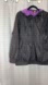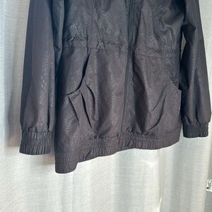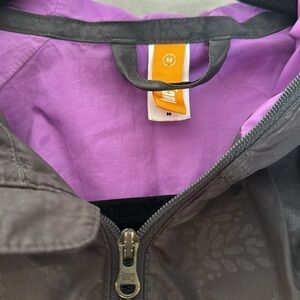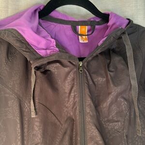STYLE: Lucy activewear jacket, shiny grey print, purple interior lining, hood, 2 deep pockets, one has a zipper pocket as well, waist can cinch, little longer in length, waterproof, windbreaker style