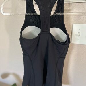 Black tank with black mesh racer back. Built in shelf bra has extra coverage in the cups. Stretchy fabric, flatlock seaming on front and back.