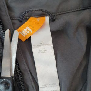 For sale is a jacket from Lucy. It is in excellent used condition with no major signs of wear. This gray, windbreaker-style jacket has zipper pockets at the waist, and a high neckline that can be flipped up or folded down. The back of the neck has "Lucy" embroidered on it. Great for working out, being outdoors or as a casual jacket for the spring and summer seasons. Size medium, approximate measurements: chest- 38", waist- 36", length from armpit to bottom- 17", sleeve inseam- 19.5"
