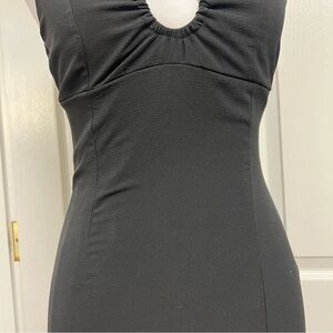 This elegant black dress features a stylish strappy with front keyhole design, perfect for any occasion. Its sleek silhouette offers a flattering fit.