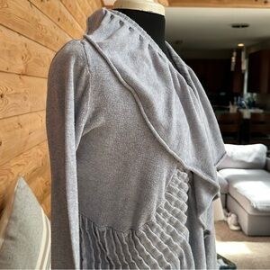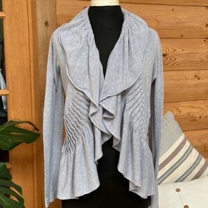 LUCY Open Front Ribbed Waterfall Draped Ruffled Grey Cardigan Sweater Size Med