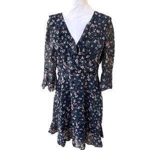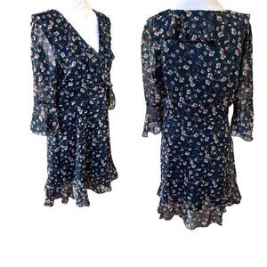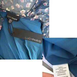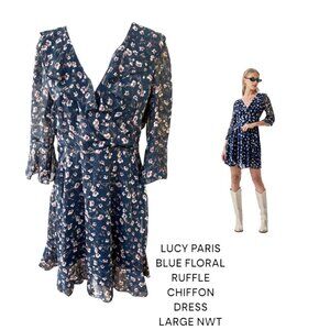 LUCY PARIS BLUE FLORAL RUFFLE CHIFFON FLUTTERY DRESS LARGE NWT