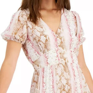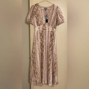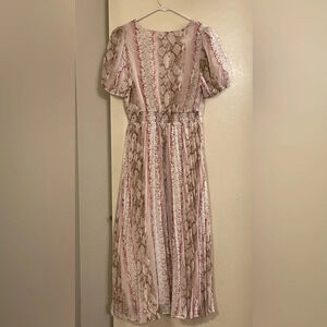 LUCY PARIS Printed Smocked Waist Pleated Midi Dress in Pink Snake