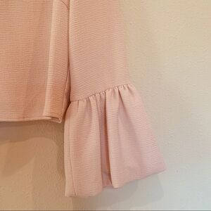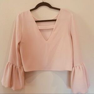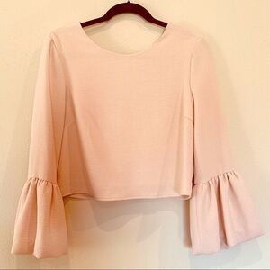 High quality blouse with a round neck and long sleeves with a gathered seam and flounce at the cuffs.