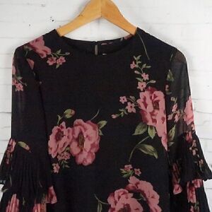 BLACK FLORAL LONG TIERED STATEMENT SLEEVE ROUND NECK BLOUSE SIZE SMALL LINED BY LUCY PARIS PRE OWNED NO FLAWS