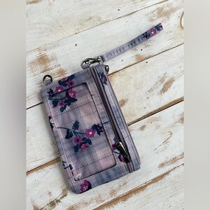 This LUG Peekaboo quilted wristlet with floral pattern in gray and purple features a convenient detachable strap.