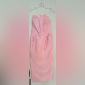 Elegant strapless pink dress perfect for any occasion. Features a flattering silhouette and a chic scalloped design. NEVER BEEN WORN. Bought as a bridesmaids dress and couldn’t return because they are made to order.