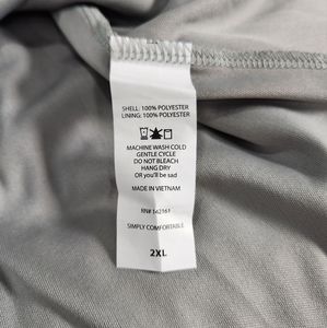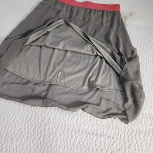 Polyester stretch waist band, salmon color and gray lined skirt. casual comfort for office or evening. You'll look amazing in this free flowing skirt.