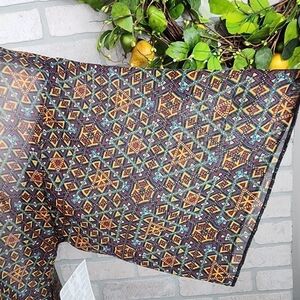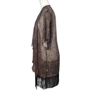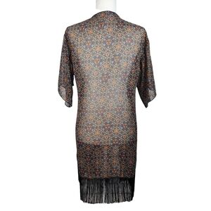 The open front kimono has fringe on the bottom hem with a geometricpattern throughout. Excellent condition.